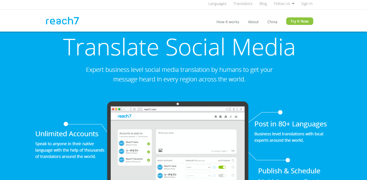 Founded just a year ago, Reach7 helps its users to reach global audience by allowing them to write their social media posts and publish them to multiple accounts and in 80+ languages. Everything is so simple: write your post, choose the target language and publish. The platform works with business level translators who translate your message into the targeted language.