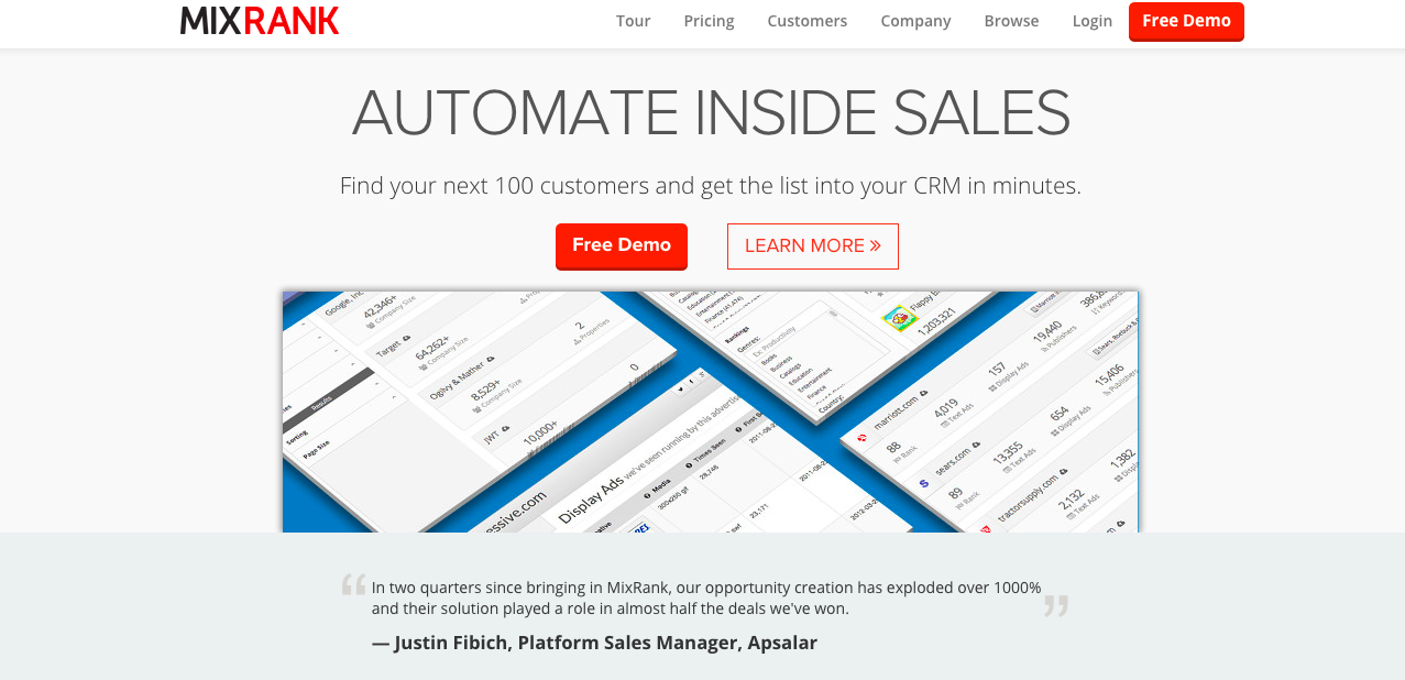 MixRank is one very useful platform that helps the sales team of your company to find new customers. MixRank offers the fastest way to building lists of the companies that you should be selling to, makes it easy to prioritize valuable leads and to contact the decision makers at these companies.